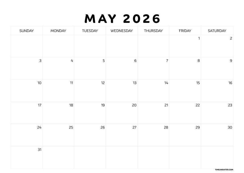 Timedater offers printables that give you instant access to templates. Anyone can get organized easily because they can download them. To find choices, type “printable May calendar” or “printable May 2026 calendar” into a search bar on Timedater. Most of them are in PDF format. Make sure that the month May 2026 calendar meets your needs, such as including holidays. We offer a free downloadable calendar; however, the same calendar could cost you some dollars on Etsy.
