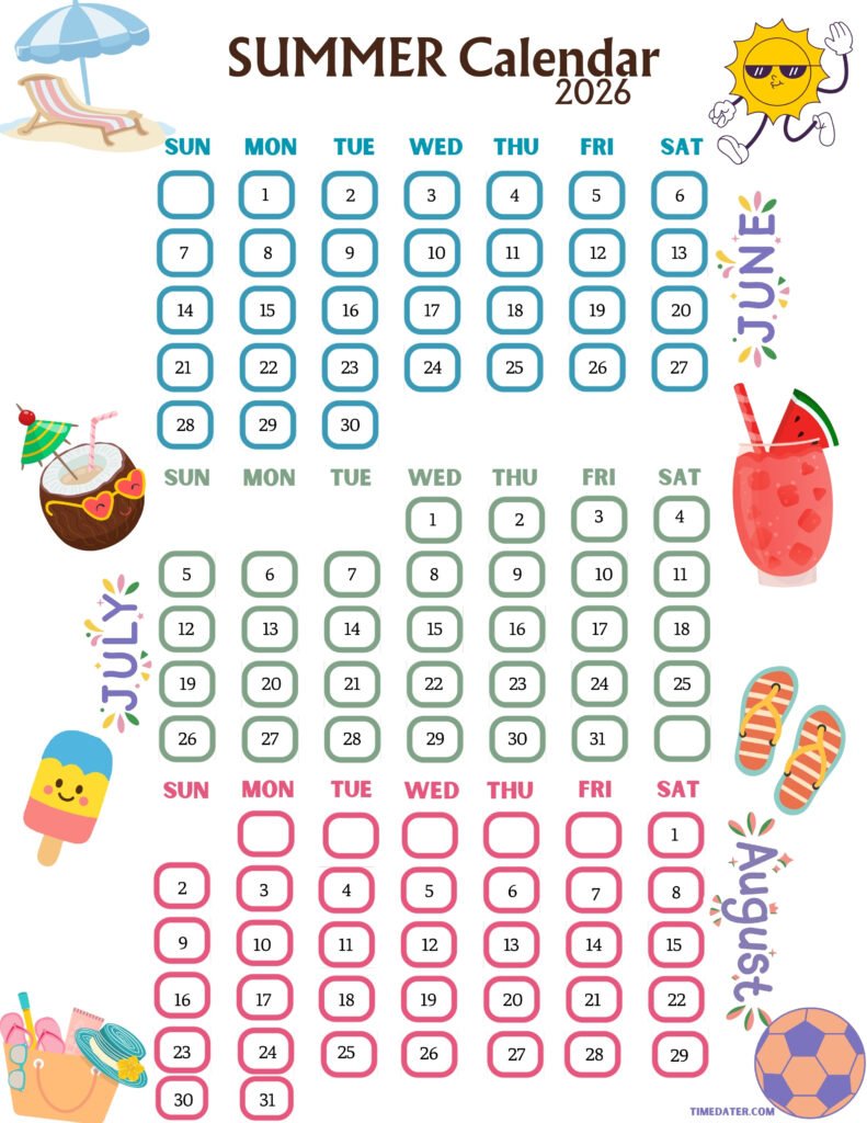 Explore our summer 2026 calendar in multiple forms to find the one that works best for you. To keep organized, you can choose from monthly calendars, weekly plans, or entire semester views. You can easily print and utilize each format because they are all available as free PDF downloads. Choose your favorite calendar format today and start making plans for the summer of 2026. Our calendars will help you take on the day.