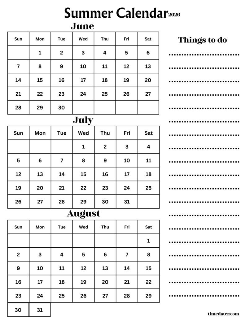 To get the most out of your time, connect date calculators directly to your summer year 2026 calendar. Use the calculators to find out when things are due, and then put those dates right away on your printable calendar. This smooth connection makes sure that your calendar always has the most accurate and up-to-date information, which will help you manage your time well in 2026. You can locate these online tools at Timedater.